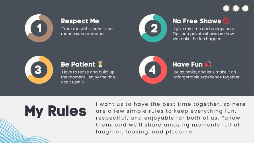 Τσιμπούκι, Βαθμολόγηση πούτσου, Cowgirl, Στα Τέσσερα, Βρωμόλογα, Βαθύ λαρύγγι, Δονητής, Δάχτυλο, Flashing, Ποδολαγνεία, Αυνανισμός, Οργασμός, Γυμνόστηθα, Γαμήσι στα βυζιά, Χύσιμο Μέσα, Handjob, Τακούνια, Οδηγίες αυνανισμού, Αφέντρα, Παιχνίδια του σεξ, Χύσιμο, Χορός twerk, Facial, Σόου με λάδι, Spanking, Στριπτίζ, Στράπον